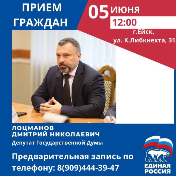 05 июня депутат Государственной Думы Дмитрий Лоцманов проведет прием граждан.