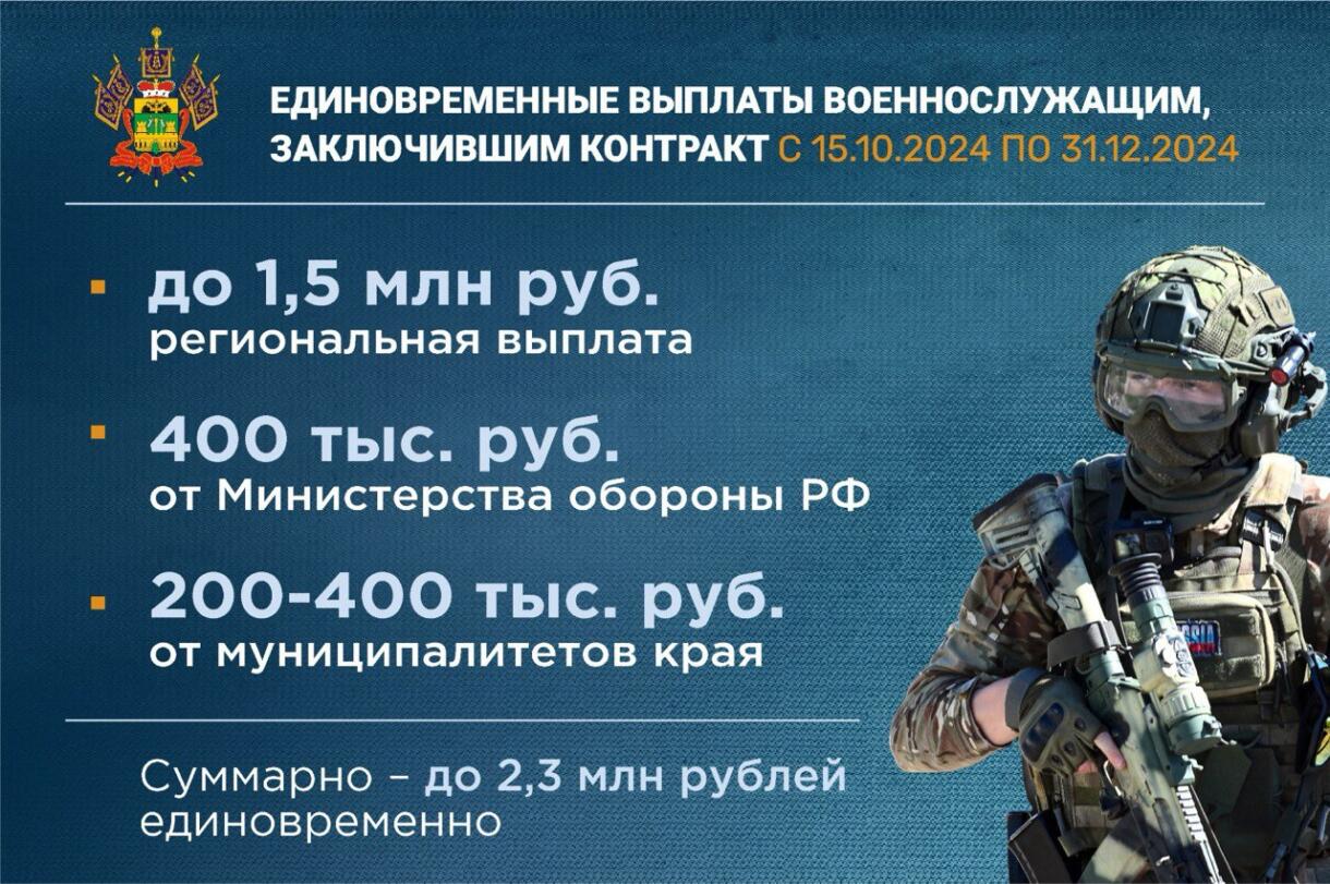 — Приняли решение увеличить единовременную выплату от Краснодарского края военнослужащим, заключившим контракт с Минобороны РФ. С 15 октября она составит 1 миллион 500 тысяч рублей. С учетом выплат от Министерства обороны РФ и муниципалитетов общая сумма может достигать 2 миллионов 300 тысяч рублей.