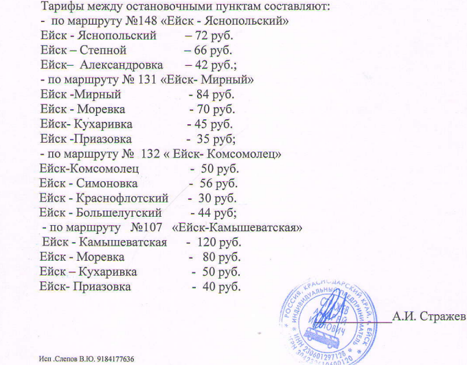 Отдел транспорта и связи администрации муниципального образования Ейский район информирует о том, что индивидуальным предпринимателем Стражевым Андреем Ивановичем с 01.03.2023 г. будут изменены тарифы на регулярные перевозки по муниципальным пригородным маршрутам регулярных перевозок: