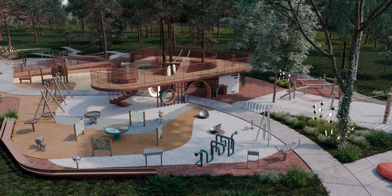 На двухуровневую площадку с большим пандусом можно будет комфортно подняться как пешком, так и на коляске. Всю конструкцию поделят на три зоны: игровую, пространство с тренажерами для детей до 14 лет и зону для взрослых с тренажерами и теннисным столом. Качели и воркаут-локации рассчитаны и на юных, и на взрослых гостей.