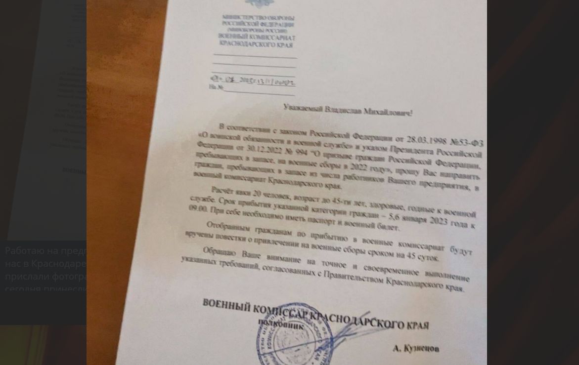 «Работаю на предприятии «Авто-альянс», у нас в Краснодаре, и сегодня нам в чат прислали фотографии письма, которое сегодня принесли из военкомата. Суть в том, что 20 человек из нашего предприятия отправляют на военные сборы на 45 дней. Но что это за сборы в самом начале года».
