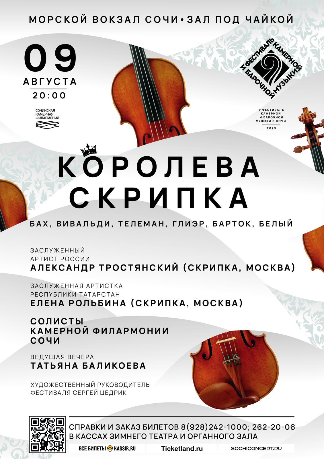 В день открытия фестиваля 9 августа гости окунутся в программу «Королева Скрипка», состоящую из шедевров и премьер скрипичной музыки Баха, Вивальди, Телемана, Глиэра, Бартока, Белого. В качестве специальных гостей выступят заслуженный артист России Александр Тростянский и заслуженная артистка Республики Татарстан Елена Рольбина.