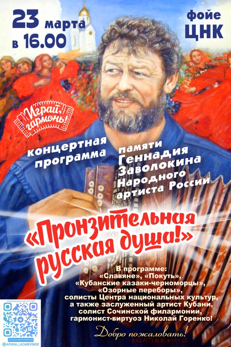 «Пронзительная русская душа!» - так называется концертная программа, посвященная памяти Народного артиста России - композитора, баяниста и гармониста, поэта, создателя популярнейшей телепередачи «Играй, гармонь» - Геннадия Заволокина. В 2023 году Геннадию Дмитриевичу исполнилось бы 75 лет.