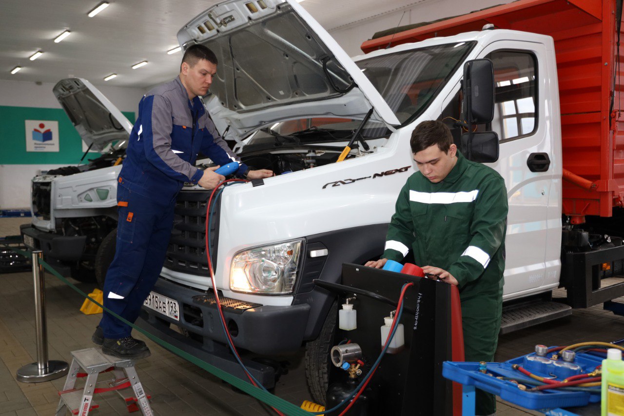 Мероприятие проходило в седьмом корпусе, что расположен на краю Брюховецкой. Седьмым корпусом называют мастерские учебного заведения. Это, своего рода, визитная карточка учебного заведения. Здесь пять мастерских по компетенциям: «Кузовной ремонт», «Обслуживание тяжелой техники», «Ремонт и обслуживание легковых автомобилей», «Обслуживание грузовых автомобилей», «Окраска автомобилей». В мастерской в ряд стоит самая современная тяжелая техника: трактора, экскаваторы — гусеничный, колесный, бульдозер-погрузчик, автомобили — КамАЗ, ГАЗ САЗ «ГАЗОН НЕКСТ», LADA, Хендай-Солярис. Кругом: сверкающая плитка, яркие тона красок, броские плакаты с изображением сельхозтехники. В мастерских работают студенты. Все, как один, в красивых новеньких темно-зеленых костюмах с нашивками и бейджиками. Экскурсию проводит заведующий отделом ДО Сергей Пелипенко. Сергей Николаевич отлично ориентируется в своем деле.