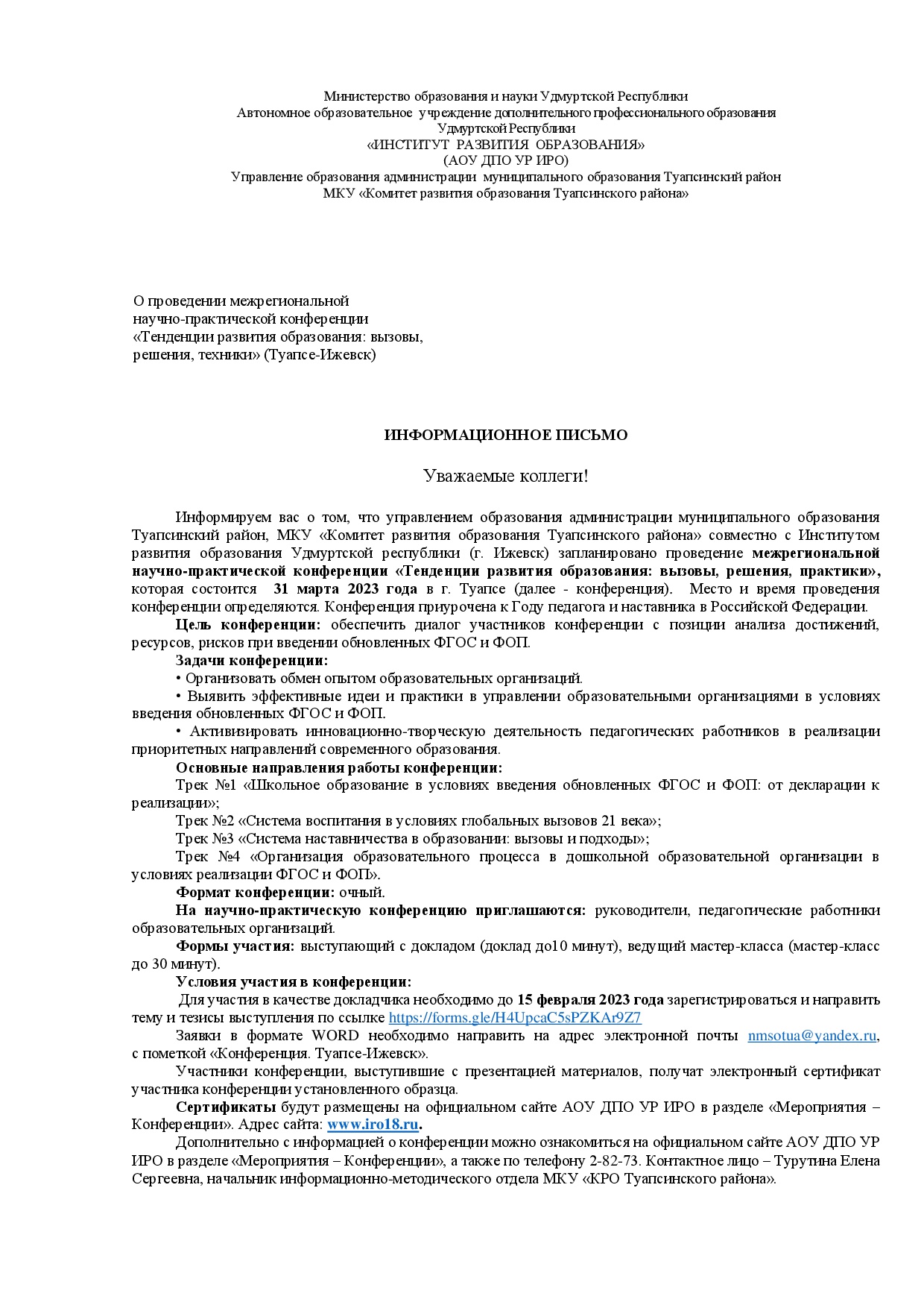 31 марта 2023 года в г. Туапсе состоится научно-практическая конференция с межрегиональным участием совместно с ИРО Удмуртской республики (г.