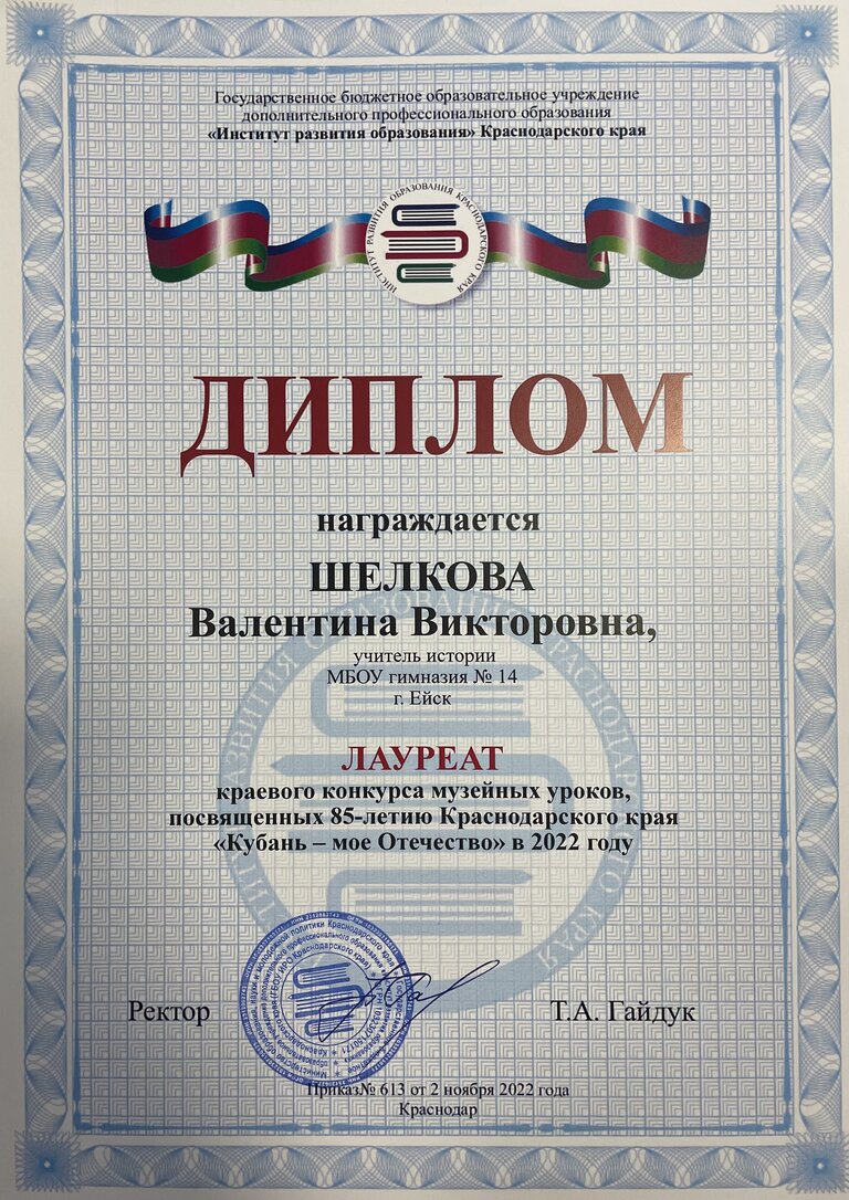 В период с 12 сентября по 31 октября 2022 года прошел краевой конкурс музейных уроков, посвященный 85-летию Краснодарского края «Кубань-мое Отечество». В конкурсе на лучший урок краеведческой направленности приняли участие 6 педагогов Ейского района. По итогам конкурса Шелкова Валентина Викторовна учитель истории гимназии №14 города Ейска стала лауреатом. Поздравляем Валентину Викторовну, желаем творческих успехов и побед.
