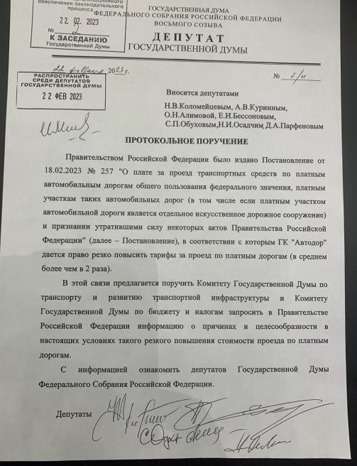 Группой депутатов фракции КПРФ, в том числе – первым секретарем Краснодарского краевого Комитета КПРФ Н.И. Осадчим, на пленарное заседание Государственной Думы был внесен проект протокольного поручения – о мотивах повышения тарифов на проезд по платным дорогам примерно в два раза.
