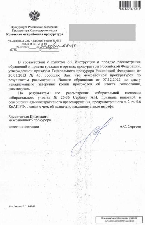 Председатель участковой избирательной комиссии № 26-36 А.Н. Сербина отстранена от должности. Она признана виновной в совершении административного правонарушения, предусмотренного ч. 2 ст. 5.6. КоАП РФ и оштрафована.