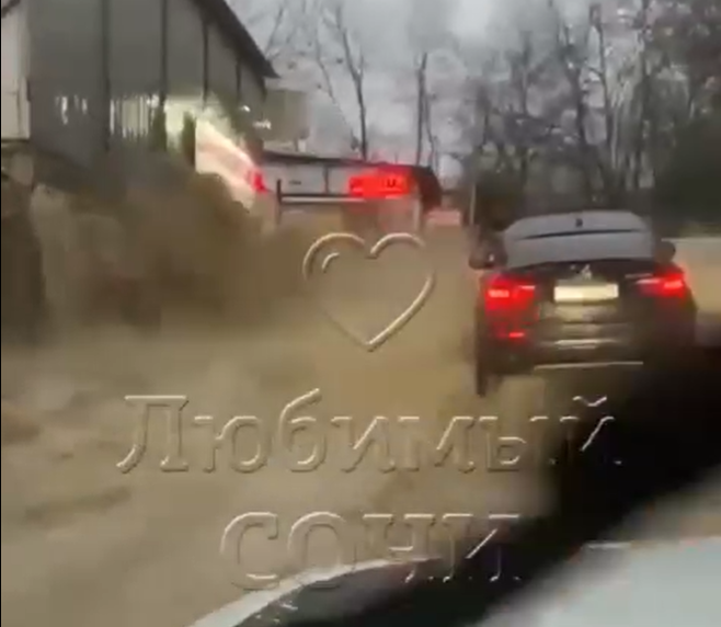 “Едем по реке переулка Виноградного. Водички чуть-чуть — буквально по бампера. Тротуар, где должны идти люди, также находится под водой. Обычная сочинская погода. В дождик у нас можно надевать водолазный костюм. И так можно идти, если сил хватит, потому что дальше подстерегают фонтаны. Они повсюду — здесь, там, где еще вы их увидете?”, — рассказал автолюбитель, который отважился выехать в непогоду.