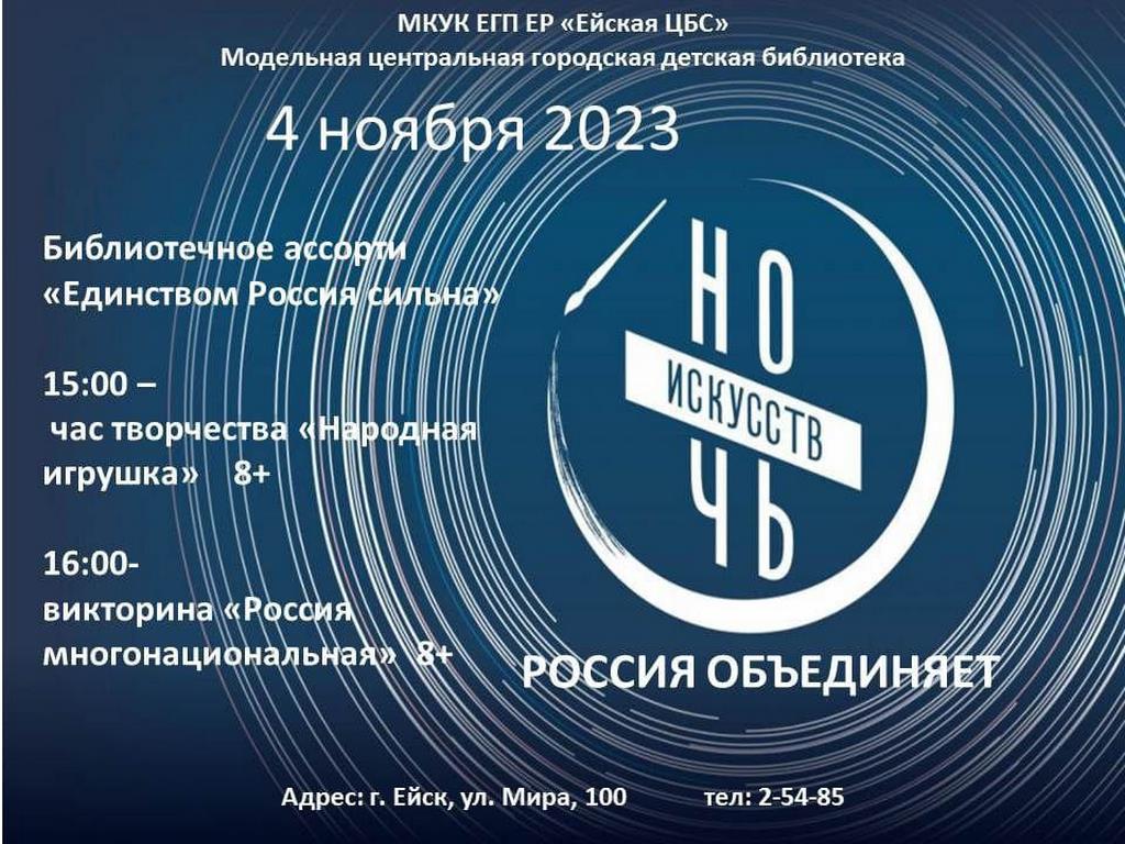 4 ноября 21023 года в 15 и 16 часов в модельной центральной городской детской библиотеке пройдет "Ночь искусств". Приходите, будет интересно!