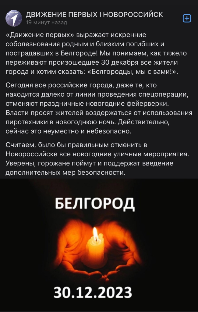 Глава Новороссийска поддержал инициативу молодежи города-героя, предложившей отменить все увеселительные мероприятия в связи с трагедией в Белгороде, где накануне погибли люди в результате террористического акта со стороны украинского режима: