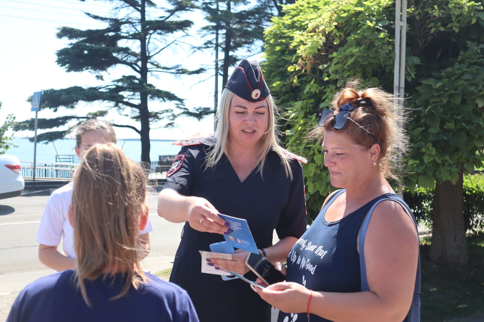 Автоинспекторы и волонтёры провели разъяснительные беседы и раздали отдыхающим и жителям города брошюры, светоотражающие наклейки и листовки с правилами дорожного движения.