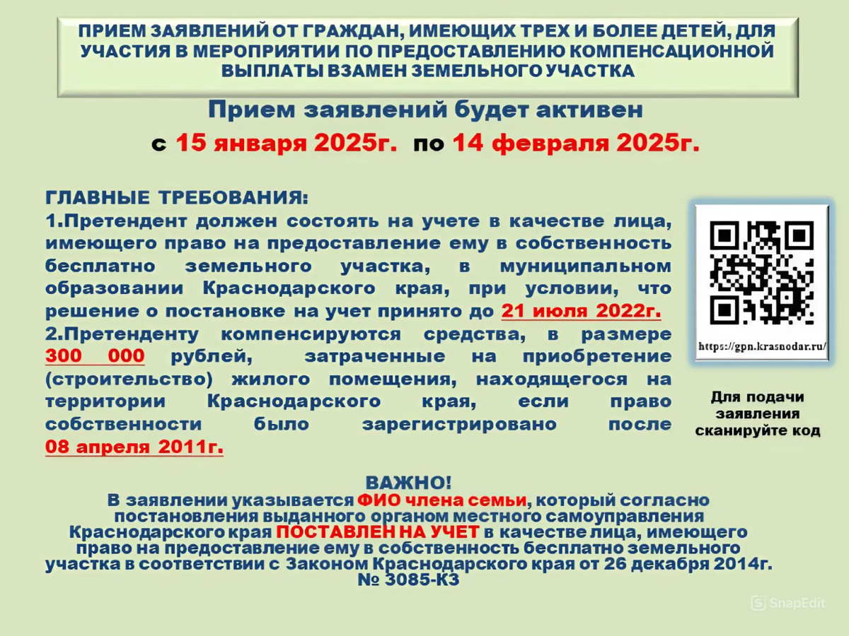 Прием заявлений осуществляется Кубанским центром государственной поддержки населения и развития финансового рынка» ( www.кубцентр.рф ), министерством топливно-энергетического комплекса и жилищно-коммунального хозяйства Краснодарского края ( www.mintekgkh.krasnodar.ru ) с 15 января по 14 февраля 2025 года.