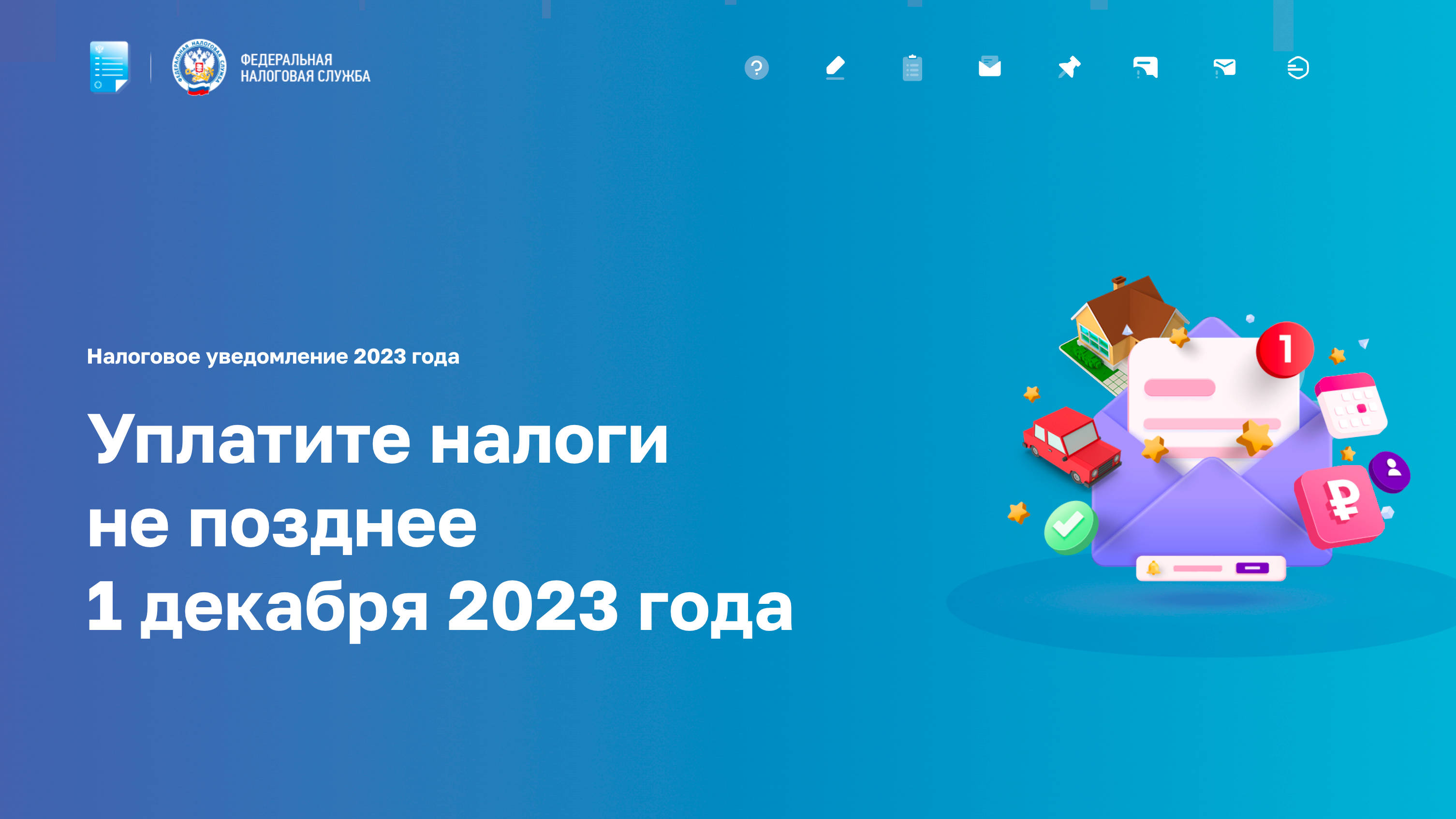 1 декабря истекает срок для своевременной оплаты физическими лицами налогов на имущество, указанных в направленных им налоговых уведомлениях за 2022 год. Так, в течение этого года в бюджеты субъектов РФ и муниципальных образований уже поступило 159 млрд руб. налогов на имущество физических лиц. Форма налогового уведомления утверждена приказом ФНС России от 27.09.2022 № ЕД-7-21/866@ и включает налоги, подлежащие уплате, сведения об объектах налогообложения, налоговой базе, сроке уплаты, а также реквизиты, необходимые для перечисления налогов в качестве единого налогового платежа в бюджетную систему РФ (QR- и штрихкод, УИН, банковские реквизиты платежа). Оплатить налоги можно с помощью сервиса на сайте ФНС России «Уплата налогов и пошлин», в личном кабинете налогоплательщика, личном кабинете на ЕПГУ. Достаточно ввести реквизиты банковской карты или воспользоваться сервисом одного из банков-партнёров ФНС России, в том числе по QR- или штрихкоду платежа, указанного в налоговом уведомлении. Кроме того, исполнить налоговое уведомление без комиссии можно в банке, на почте или в МФЦ, а также в кассах местных администраций. Если налогоплательщик не оплатит налоги вовремя, то уже со 2 декабря 2023 года задолженность будет расти ежедневно за счет начисления пеней. В этом случае налоговый орган направит требование о ее уплате. Если должник его не исполнит, последует обращение в суд. Далее долг будут взыскивать принудительно судебные приставы, которые могут принять ограничительные меры, например, заблокировать банковский счет должника. Если гражданин, владеющий налогооблагаемыми недвижимостью или транспортом, не получил налоговое уведомление за 2022 год и при этом не имеет налоговых льгот, он может обратиться за ним в любой налоговый орган, уполномоченный МФЦ или направить соответствующее заявление через «Личный кабинет налогоплательщика» или сервис «Обратиться в ФНС России». Направленные по почте налоговые уведомления налогоплательщик также дополнительно может получить в любом налоговом органе, обслуживающем физических лиц, или в МФЦ, уполномоченном на оказание такой услуги. Для этого он или его уполномоченный представитель может подать заявление по установленной форме, которое рассматривается в течение пяти дней со дня его получения налоговым органом. Подробности о содержании и исполнении налоговых уведомлений можно узнать на промостранице.
