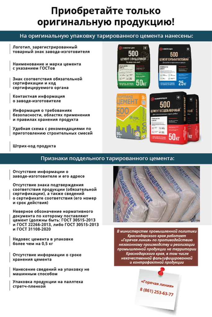 В соответствии с комплексом мероприятий, направленных на противодействие незаконному обороту фальсифицированного тарированного цемента на территории Краснодарского края просим пользоваться памяткой об отличительных признаках оригинального цемента от фальсифицированного