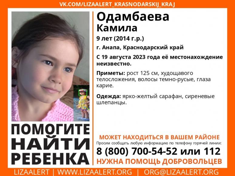В Анапе правоохранители и добровольцы разыскивают 9-летнюю девочку – Камилу Одамбаеву. Вчера, 19 августа, она вышла на прогулку и пропала.