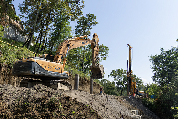 Участок укрепят, выполнив устройство двух подпорных стен. Общая протяженность инженерной защиты составит 117 м. Забурено уже около 40 свай — половина от необходимого количества. Также будет произведен монтаж системы отведения ливневых вод.