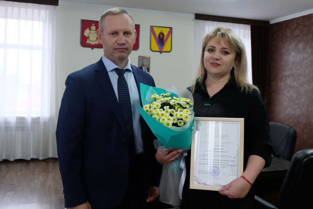 Глава района Роман Парахин передал почетную грамоту от министерства сельского хозяйства и перерабатывающей промышленности Краснодарского края заместителю директора по коммерческой деятельности ООО «Волна» Софье Щербаковой.