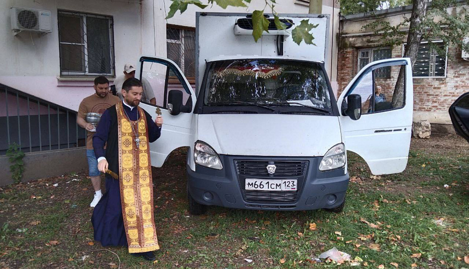Перед отправкой гуманитарного груза протоиерей Андрей Солоп совершил краткий молебен и окропил машины святой водой, благословив в добрый путь.