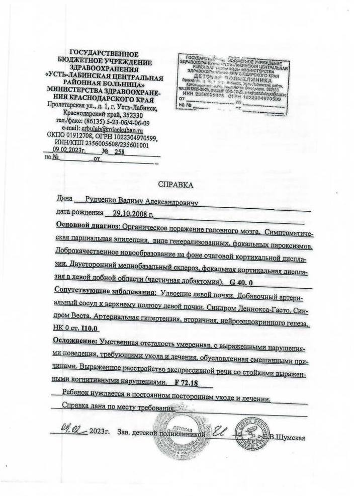 Основной диагноз мальчика на сегодняшний день: органическое поражение головного мозга, симптоматическая парциальная эпилепсия, доброкачественное новообразование на фоне очаговой кортикальной дисплазии, двусторонний медиобазальный склероз и фокальная кортикальная дисплазия в левой лобной области.