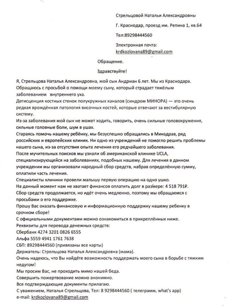 Путь от неизвестности до диагноза и лечения оказался сложен и страшен. Но семье удалось найти врача, который готов провести такую уникальную и отчасти экспериментальную операцию: Стрельцовы узнали об американской клинике, которая специализируется на подобных патологиях. Но счет, выставленный за операцию на обоих ушах — более 30 млн руб., — оказался неподъемным для обычной кубанской семьи. Родители мальчика обратились за помощью, был организован народный сбор средств, благодаря чему удалось собрать часть суммы.