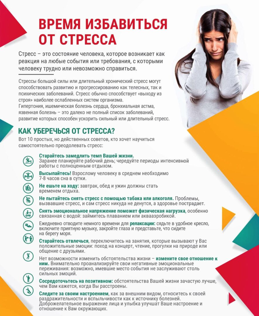 Если вы желаете минимизировать стресс в своей жизни, отведите себе ежедневное время для релаксации: сядьте в удобное кресло, включите приятную музыку, закройте глаза и представьте, что сидите на берегу моря. Находите время на занятия, которые вызывают у вас положительные эмоции: поход в музей, кино, на концерт, чтение, прогулки на природе или общение с друзьями. При стрессе также очень важно делиться своими чувствами с близкими, поэтому в семье должна быть доброжелательная атмосфера.