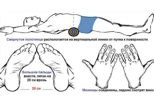 Как лежать на валикеПациент ложится на твердую поверхность, вытягивает руки и ноги, соединяет пальцы стоп и кистей, как показано на рисунке, валик кладется перпендикулярно позвоночнику на разных уровнях, в основном под грудной и поясничный отделы и лежит так 5 минут под каждым отделом, но начинаем с 2-3 минут. Для детей и взрослых используется разный диаметр валика.