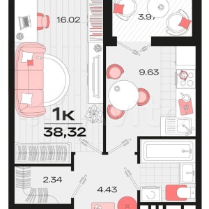 - Общая площадь: 38.3 м²