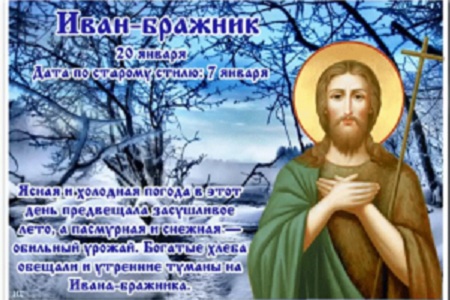 А в народном календаре 20 января обозначено как день Ивана Бражника. Или, по-другому, Зимний свадебник, Перезимник и Зимний мясоед. «Бражником» покровителя дня назвали потому, что в этот день разрешалось и даже полагалось употреблять напитки «с градусом», чтобы «запить» зло. При этом утверждалось, что этот день является исключением, а «праздновать» часто –пустить семью по миру.